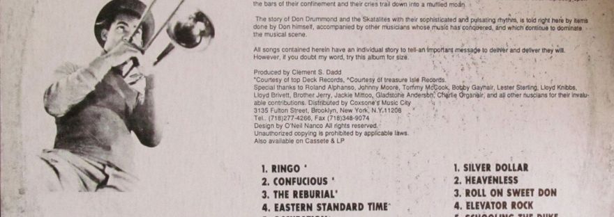 This album also credits the artist who performed with Don Drummond on these tunes, or certainly some of them: Roland Alphonso, Johnny Moore, Tommy McCook, Bobby Gaynair, Lester Sterling, Lloyd Knibb, Lloyd Brevett, Brother Jerry (Jah Jerry Haynes), Jackie Mittoo, Gladstone Anderson, and Charlie Organaire. If you are near Chicago and attend any of the Jamaica Oldies events hosted by Chuck Wren you will see Charlie Organaire take the stage with his harmonica for a few tunes, and let me tell you, he is amazing. Charlie lives in Chicago. Lester still performs frequently with the Skatalites, but unfortunately, all other musicians listed here have returned to the universe to commune.